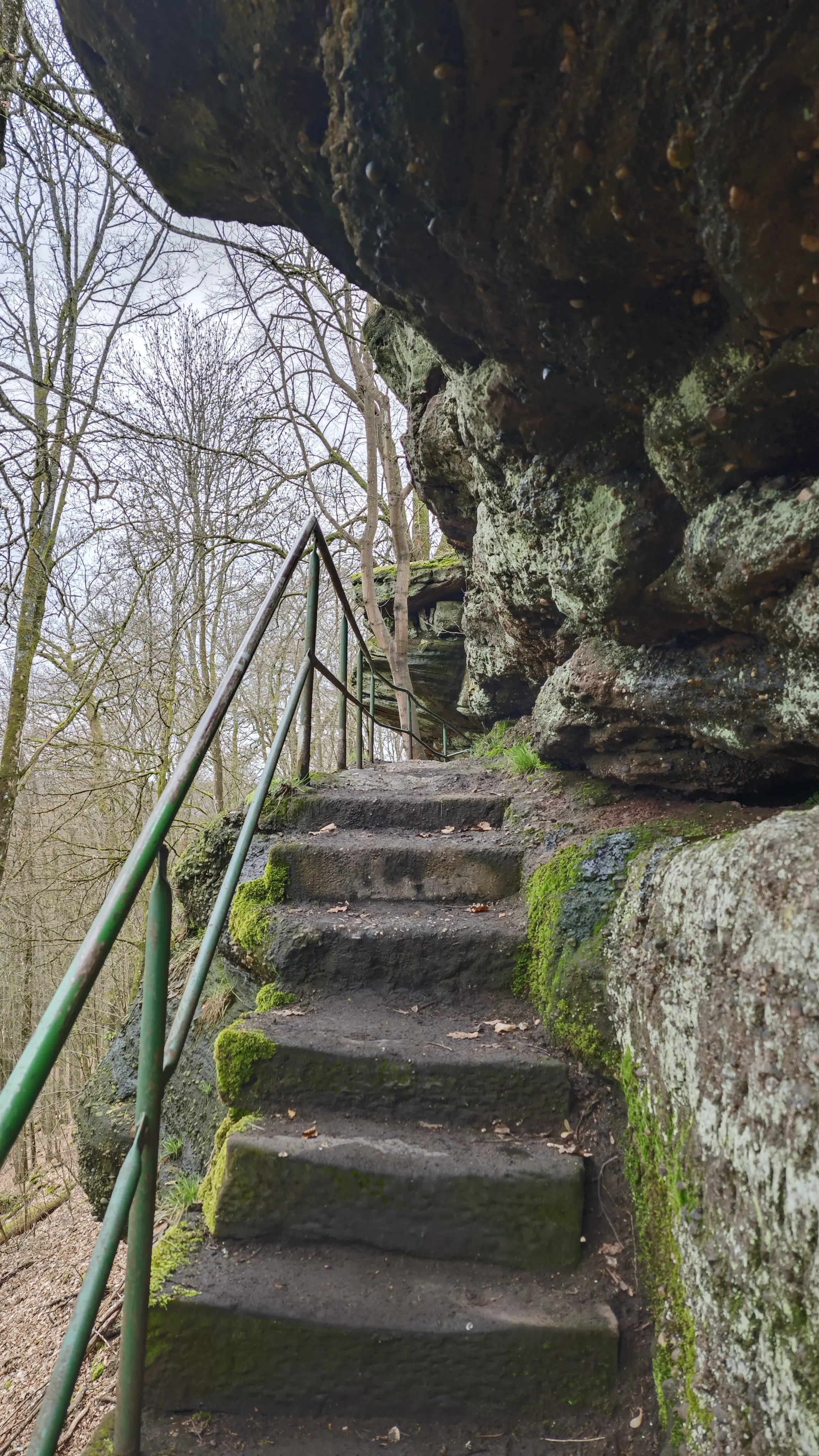 Fast geschafft - ein weiterer Anstieg bringt euch zum Westfels des Drachenfels-Massivs. Tolle Aussicht über den Pfälzerwald inklusive! Genießt die Aussicht und geht über den Felsenweg nach oben zum Südfels. Ein schmaler Weg über den Bergrücken entlang führt euch direkt zum Südfelsen mit seinem beeindruckenden Plateau. Kuz bevor ihr den Südfelsen erreicht, befindet sich linker Hand ein kleiner Abstieg, der mit einem Geländer gesichert ist. Er führt euch zur Drachenhöhle.