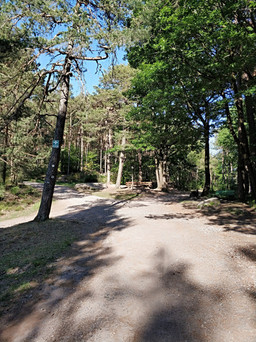 Wir starten am Wander-Parkplatz "Hahnenschritt" - eine genaue Anfahrtsbeschreibung findet ihr weiter unten. Zu Beginn des Weges folgen wir gleich links den Schildern "Fahrweg zum Hohe Loog Haus" - ein breiter Wanderweg, der auch für Kinderwägen oder Fahrradanhänger gut zu bewältigen ist. Euch erwartet ein beeindruckender Blick über den Pfälzer Wald. Es geht immer geradeaus bis zu einer Weggabelung. Wichtig: Hier halten wir uns auch wieder auf dem Fahrweg ganz links!